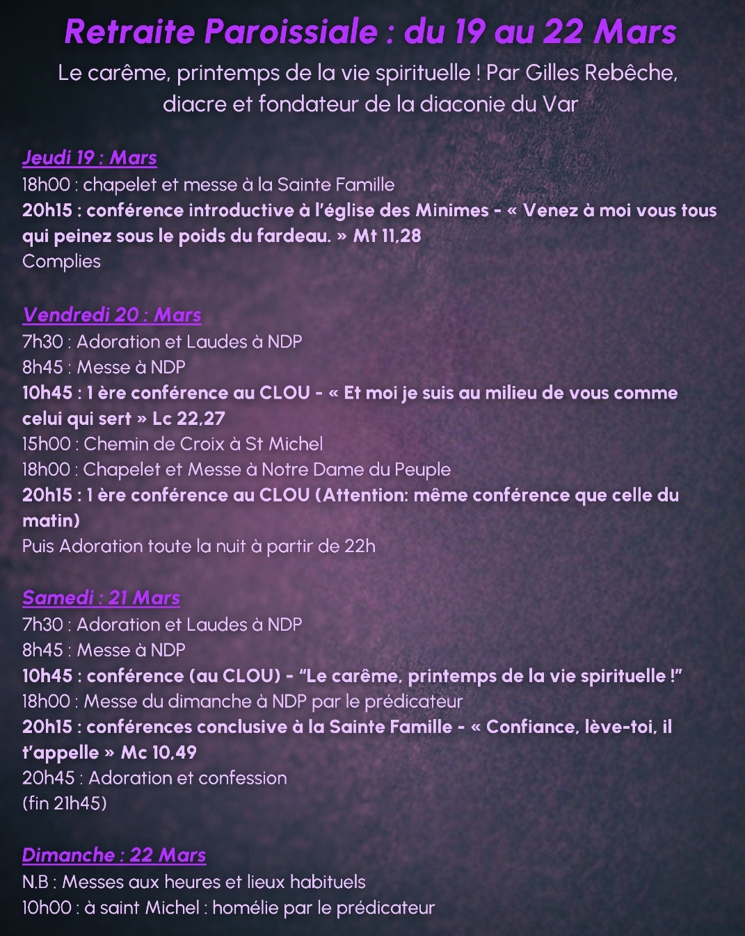 Nous avons la joie de vous inviter Ă notre grande retraite paroissiale annuelle. Cette annĂ©e, nous aurons le privilĂšge d’ĂȘtre accompagnĂ©s par le Diacre Gilles RebĂȘche, fondateur de la diaconie du Var, qui guidera nos rĂ©flexions et nos priĂšres tout au long de ce chemin vers PĂąques.